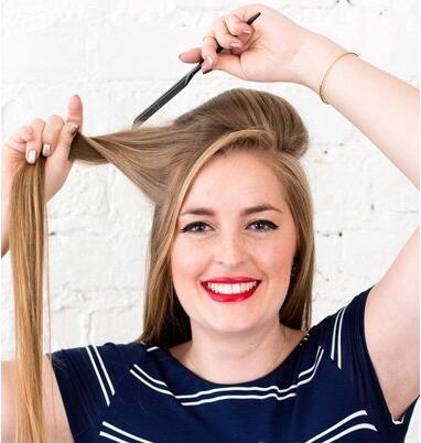 第三步:再将右侧上方的发丝拉出来,用密齿梳倒梳打毛,让服帖的发丝变得饱满一些。