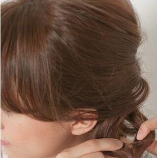 第七步:散落在脸庞右侧的额前发际线位置的一缕直发,用电卷棒烫成卷发。