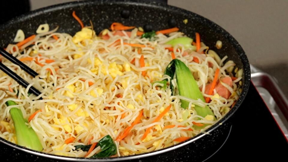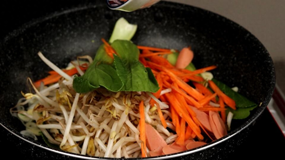 【主要食材】:熟面条,胡萝卜,火腿肠,上海青,豆芽,鸡蛋,