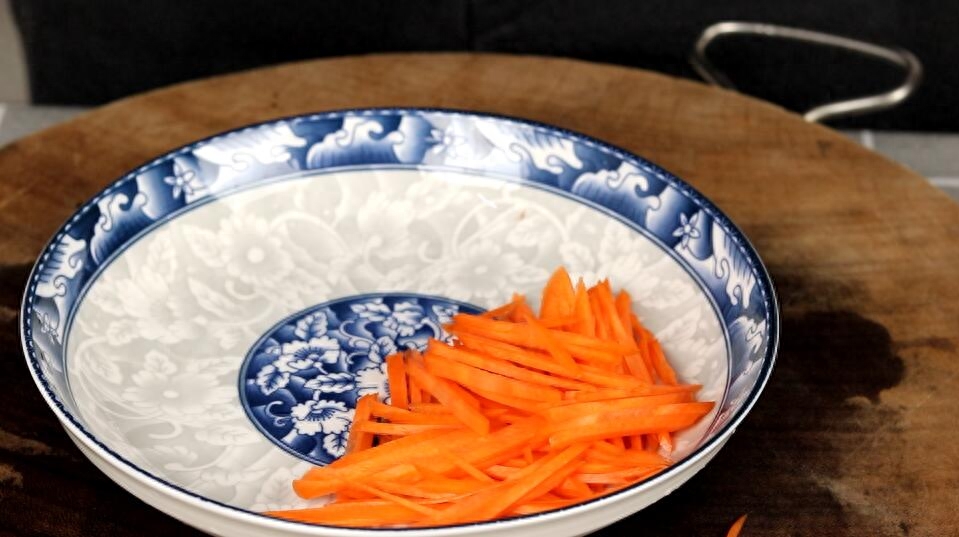 1、首先切点胡萝卜,先将胡萝卜切成片,然后改刀切成丝;准备一根火腿肠,将火腿肠切成片,再准备一颗上海青,把它掰开,然后准备一把豆芽