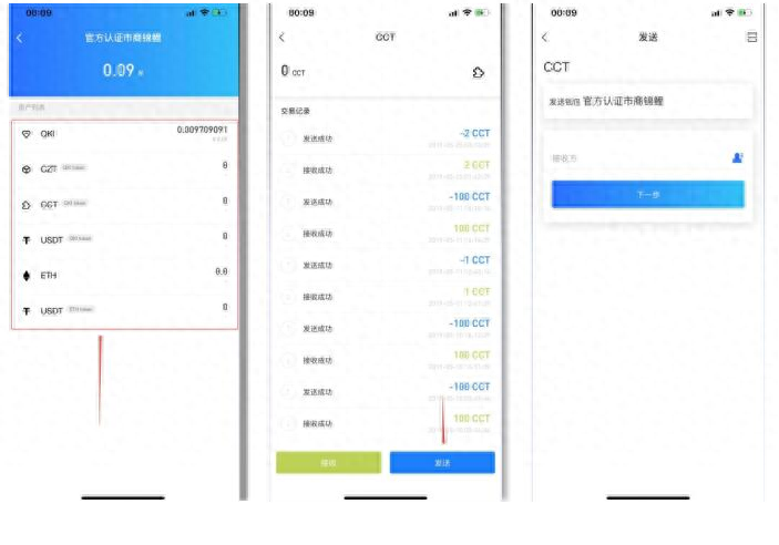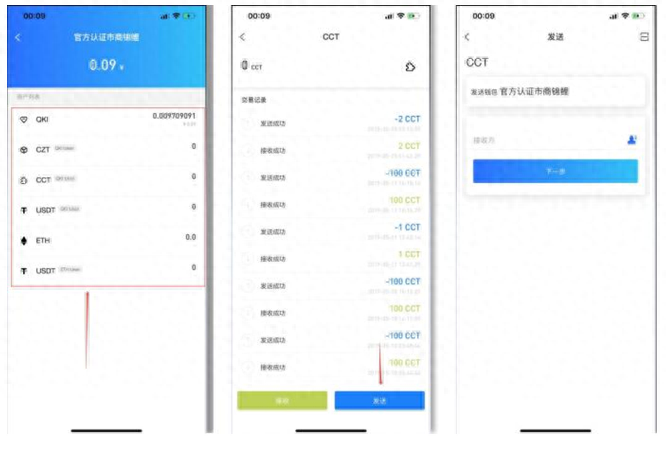 步骤:钱包里点击图中红框中的 CCT 这项资产,然后选择发送,接收方中填入链信的地址,下一步填入需要发送的数量,最后输入密码即可。(保证钱包中有 QKI 作为手续费,可通过他人转账或者在 OTC 上购买。)