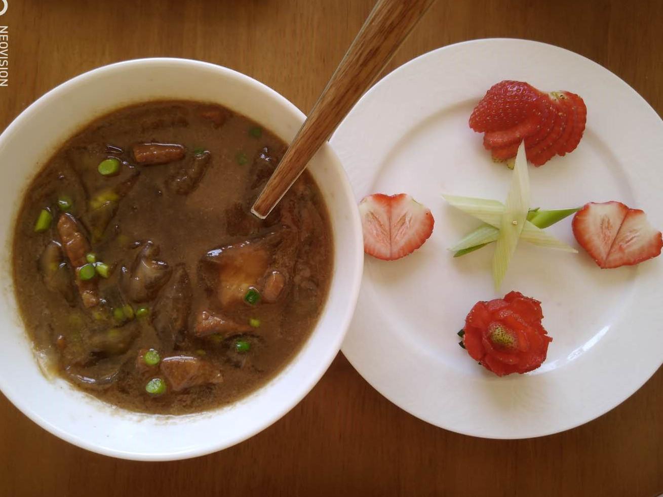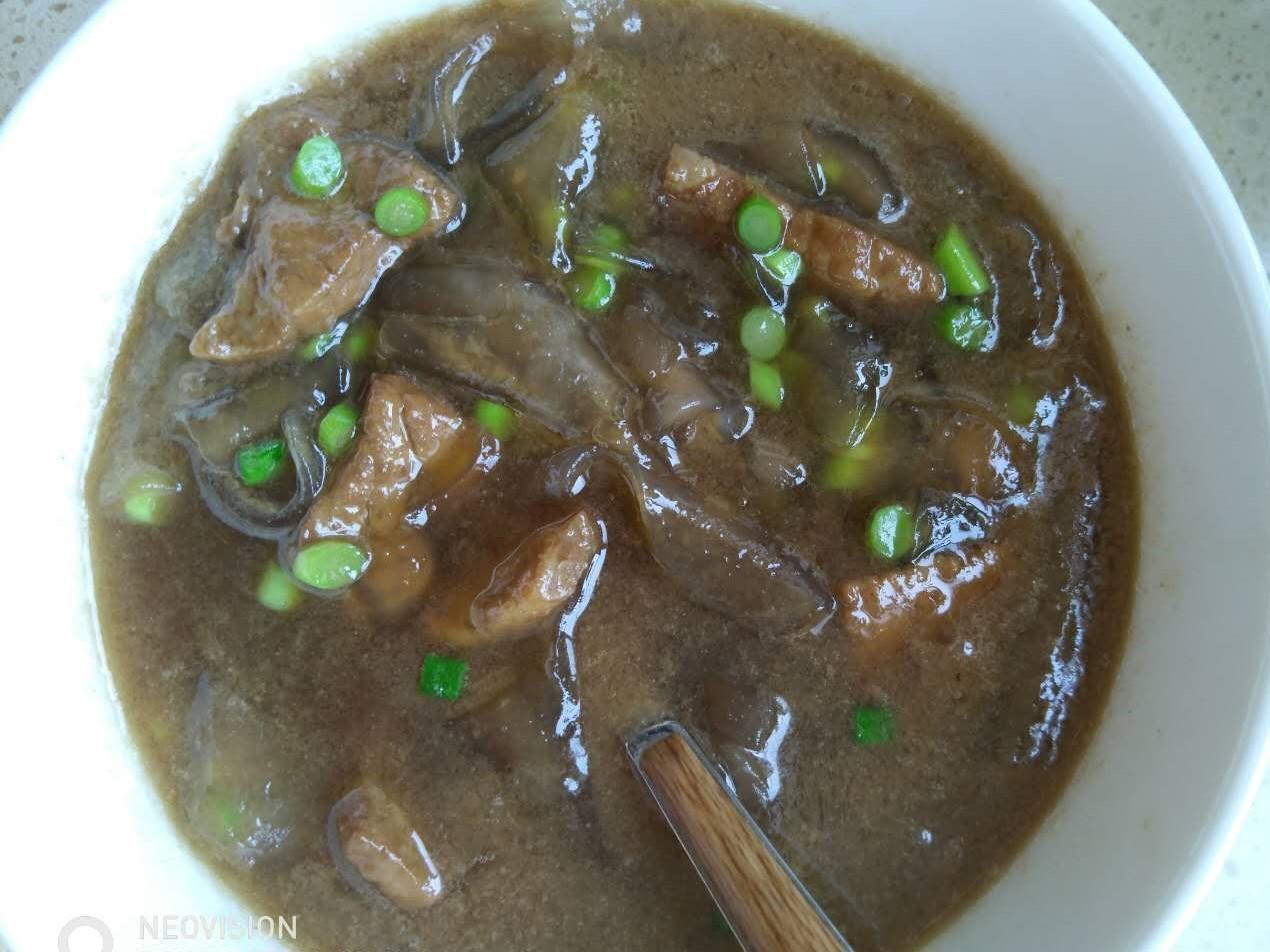 油锅放入肉片滑散,加点酱油上色,肉炒变色后先盛出来备用。锅内加入开水,放入粉皮大火煮开,转小火煮至粉皮变成透明状,放入炒好的肉片,出锅前将切好的蒜苔粒放入即可。