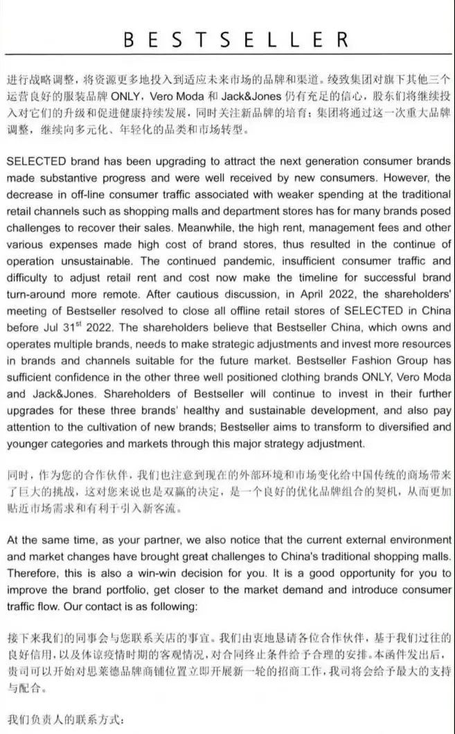 5月9日,网上流传一份有关绫致集团旗下的男装品牌思莱德(SELECTED)终止中国零售业务的告知函。