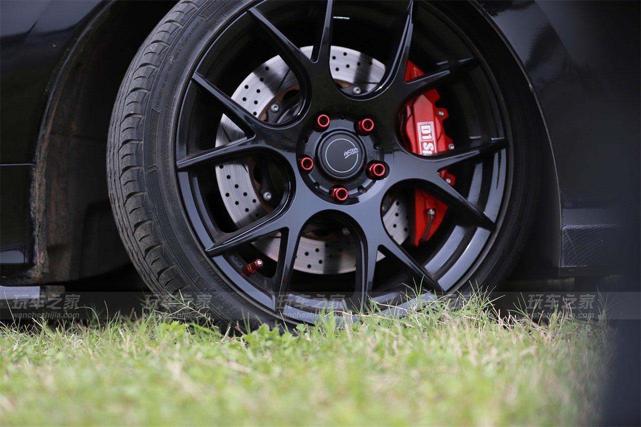 行走系统改装了18寸ARTKA旋压轻量化轮毂,搭配的是225/40/18轮胎。而制动方面也换成了台湾D1锻造大四活塞卡钳,配345mm的刹车盘。