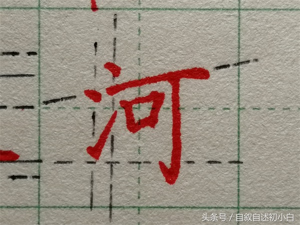 三点水的第一点在横的上方。 第二点与横画对齐 提画指向的位置大概是口字的竖画。 “可”字竖钩与横画相交于横画的2/3处。
