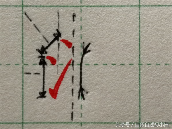 左侧的撇与竖钩的夹角要小。