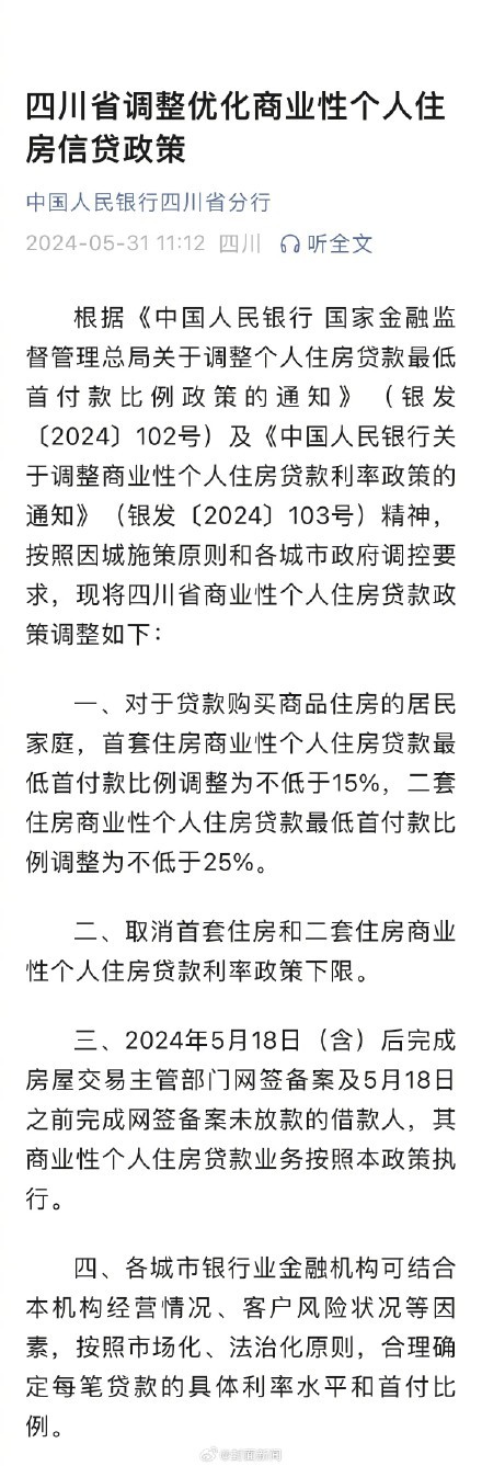 5月31日,人民银行四川省分行通过其微信公众号正式发布了四川的房贷新政。现将四川省商业性个人住房贷款政策调整如下:首套商住房贷款首付比例不低于15%,二套不低于25%,取消利率下限。(中国人民银行四川省分行)