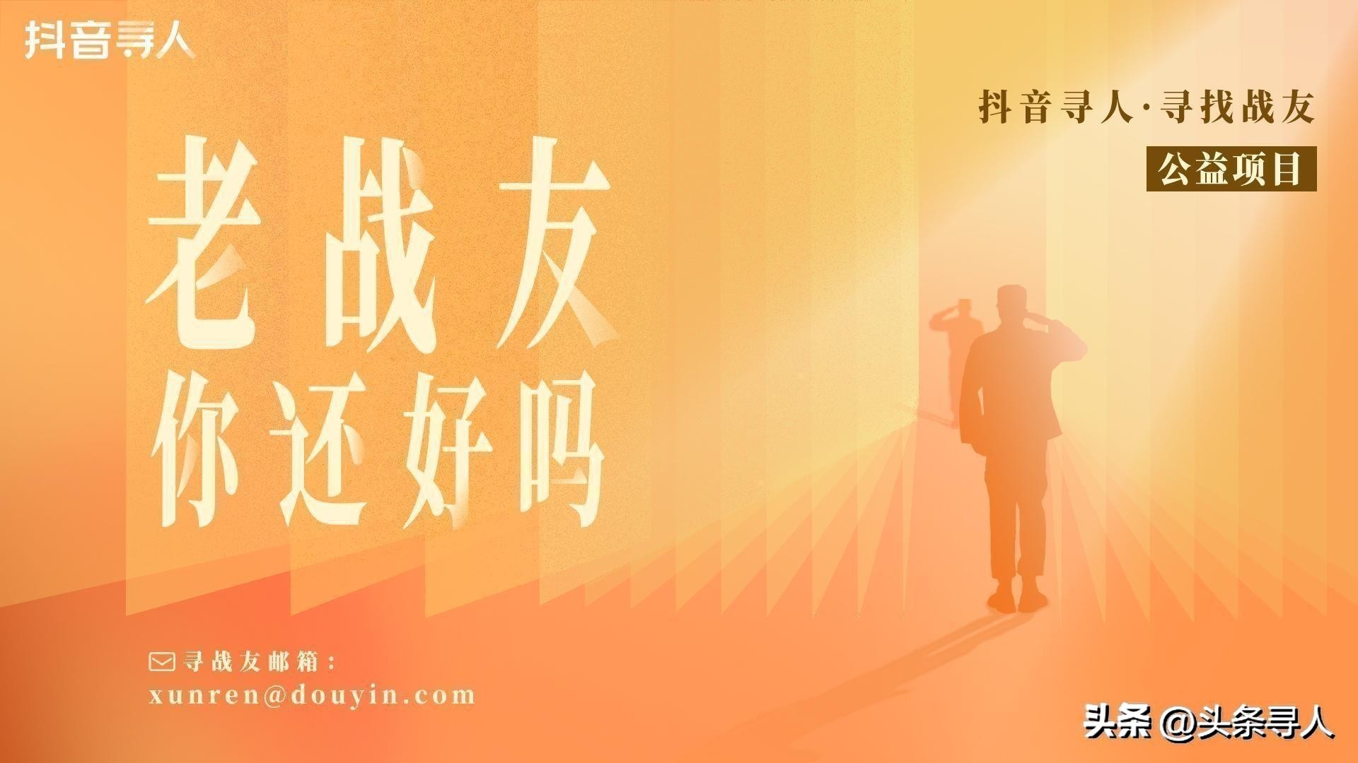 如有失联战友相关线索,请您与我们联络。如果您需要寻找战友,可以通过邮箱(xunren@douyin.com)、抖音(名称:抖音寻人)、微信公众号(名称:抖音寻人)、微博(@抖音寻人)联系我们,或寻人点这,将有专门的工作人员对信息进行核实和后续跟进。