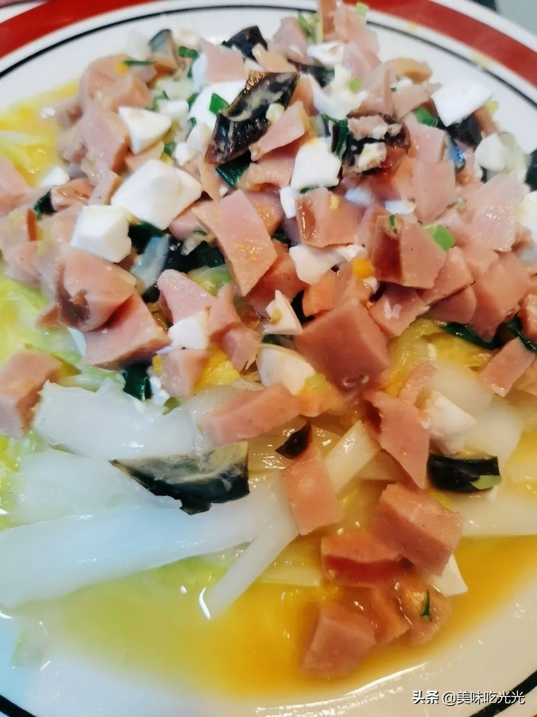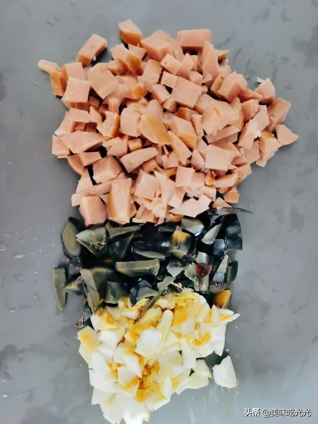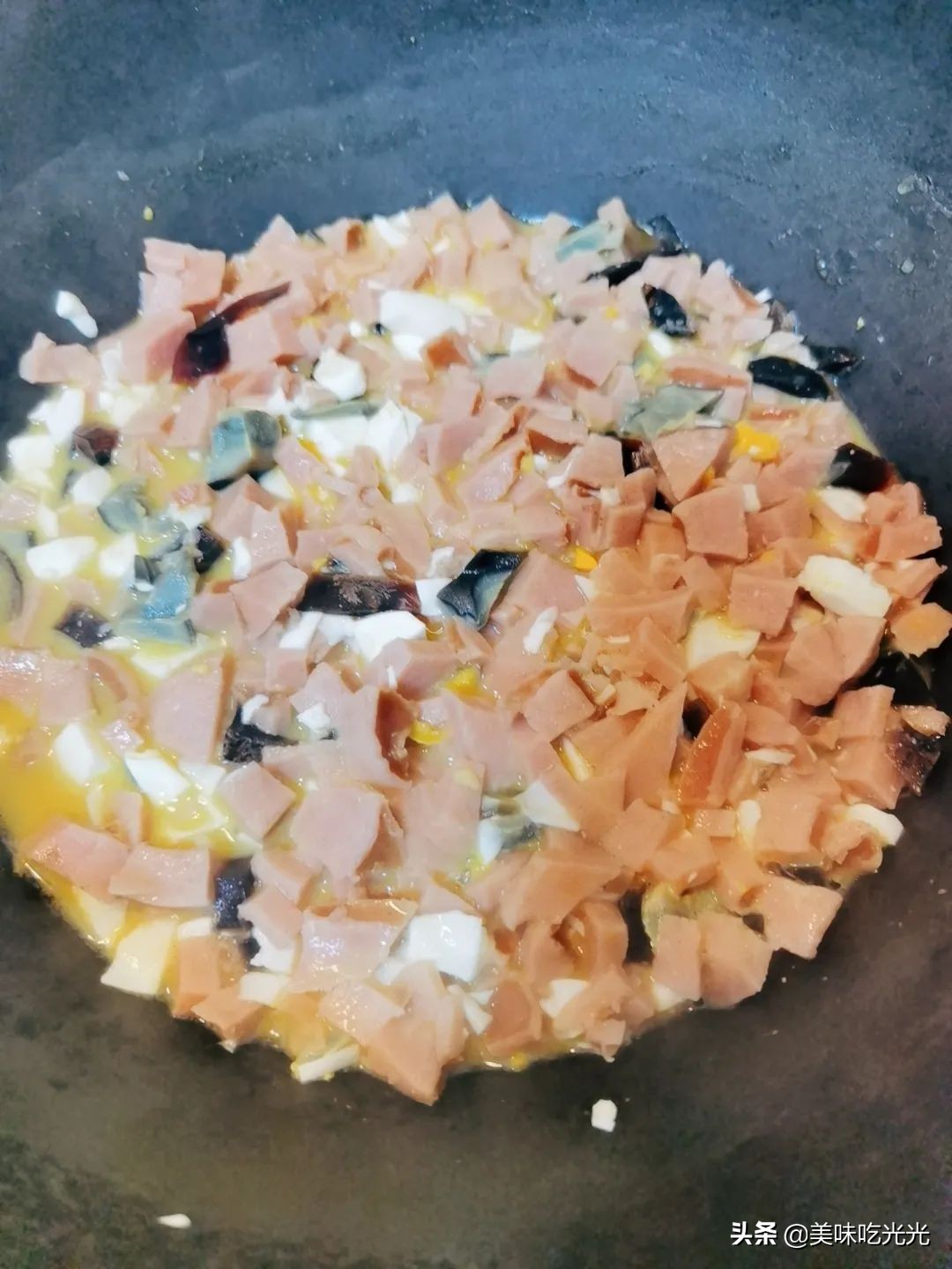 这个时候,我们把火腿、咸鸭蛋、皮蛋 切丁。