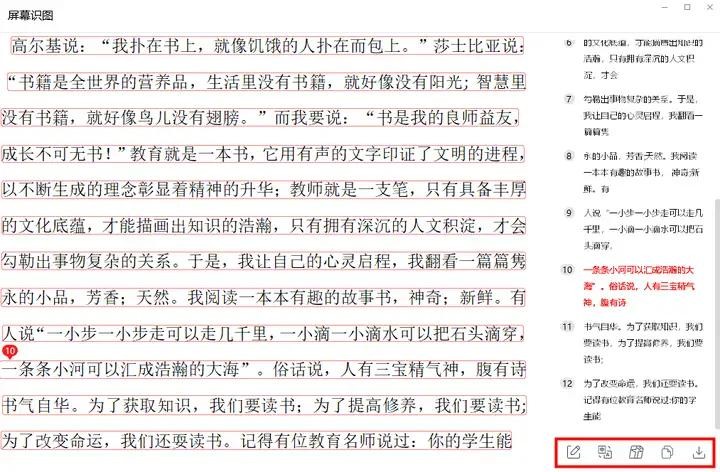 上传图片,双击图片,选择下方的【提取图中文字】图标,进入识别页面,软件就会将图片中的文字一句句的识别出来,可以对识别后的文字进行复制、翻译、下载等操作