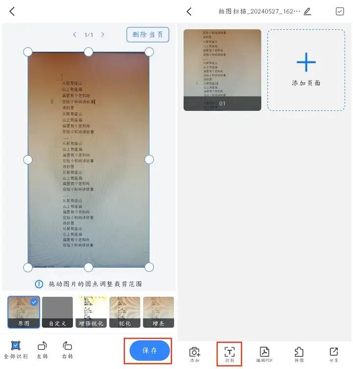 拖动画面中的圆点设置识别范围,设置识别原图、锐化、增亮等,然后点击保存,进入扫描页面,可以在这里点击添加页面上传多张图片处理,然后点击识别,软件就会自动扫描识别图片中的内容
