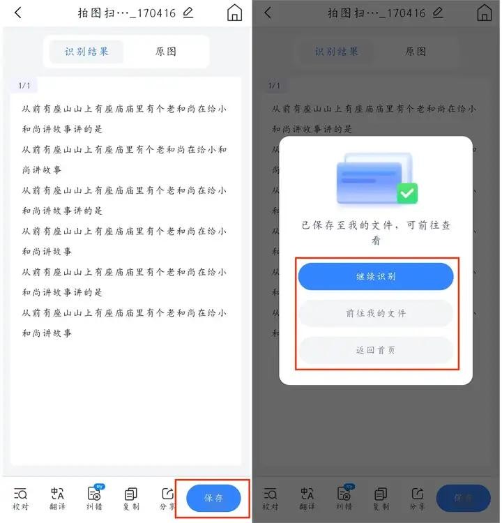 稍过一会,就能得到识别后的文字,识别后的文件几乎没有错别字,自带整齐的格式,同时在这里可以校对、翻译、纠错、复制、分享和保存,保存后的文件可以在我的文件中找到