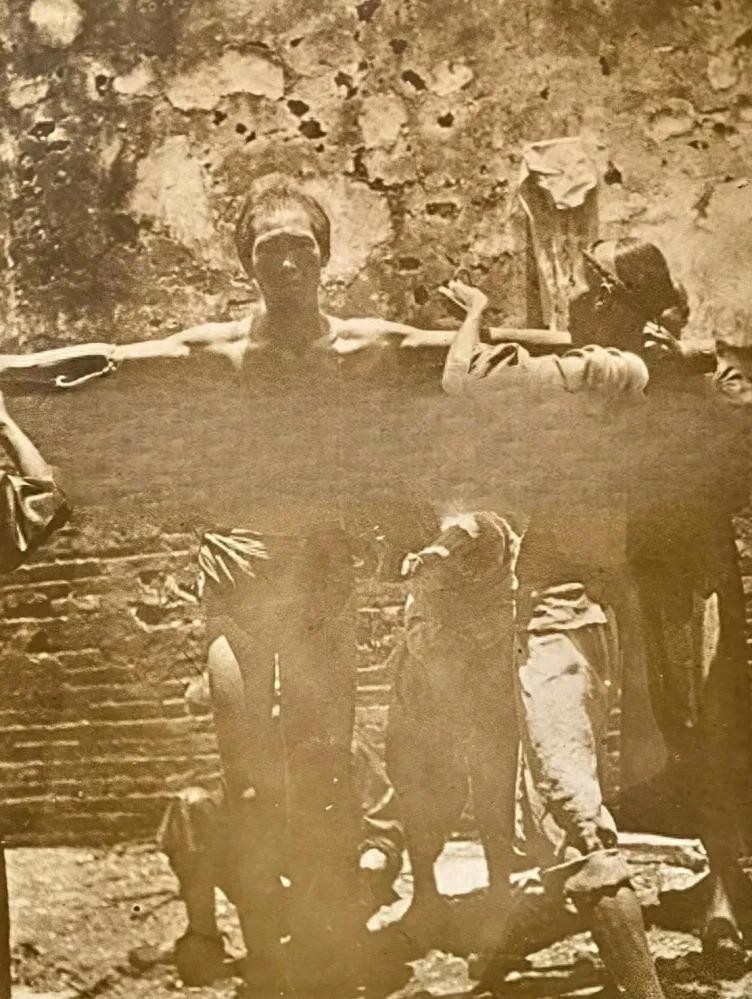 镜头前这个男子被绑在一个高高的木架上,他的背后是一面高墙,他赤着上身,只穿了一条遮羞的短裤。他的双臂看起来粗壮有力,显然是长期从事体力劳动的痕迹。这位男子可能是一个农夫、工匠或任何生活在社会底层的人。然而,此刻的他,面对命运的严酷审判,已无法主宰自己的命运。