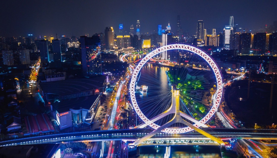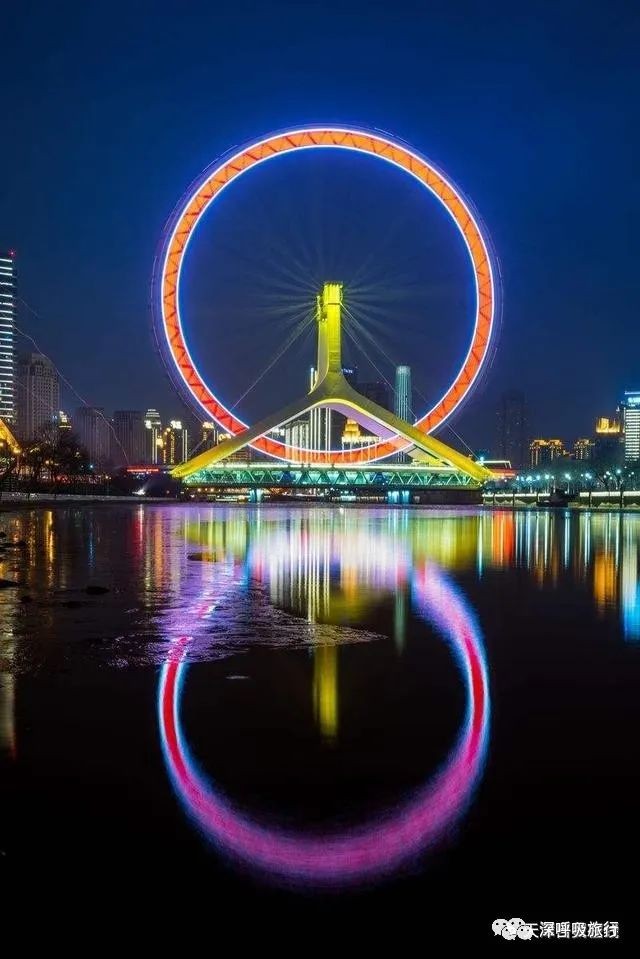 都说摩天轮是浪漫的象征,和爱的人一起在离星星最近的地方眺望整个世界,享受只属于彼此的温暖瞬间。摩天轮旋转一周所需时间约30分钟,到达最高处时,周边景色一览无余,甚至能看到方圆数十公里的景致,成为名副其实的“天津之眼”。