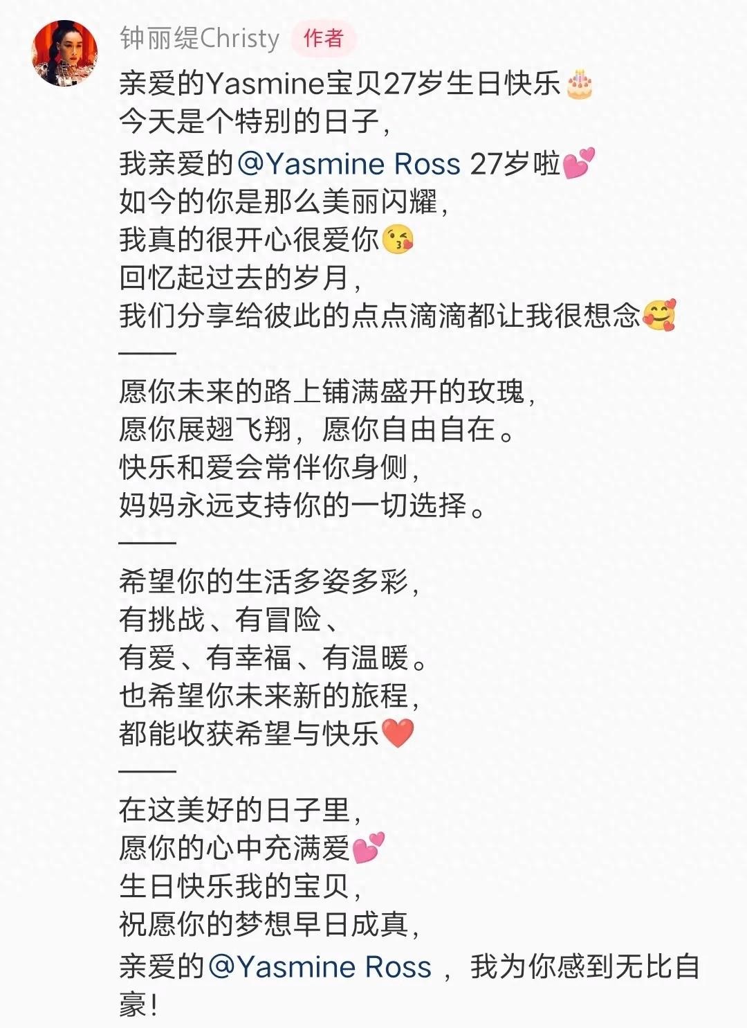 1月8日,钟丽缇在其个人社交账号晒图为大女儿Yasmine庆祝27岁生日,Yasmine 是钟丽缇与第一任外籍老公所生,有着非常出众的五官,和混血长相,也是钟丽缇三个孩子中最像她的一个。