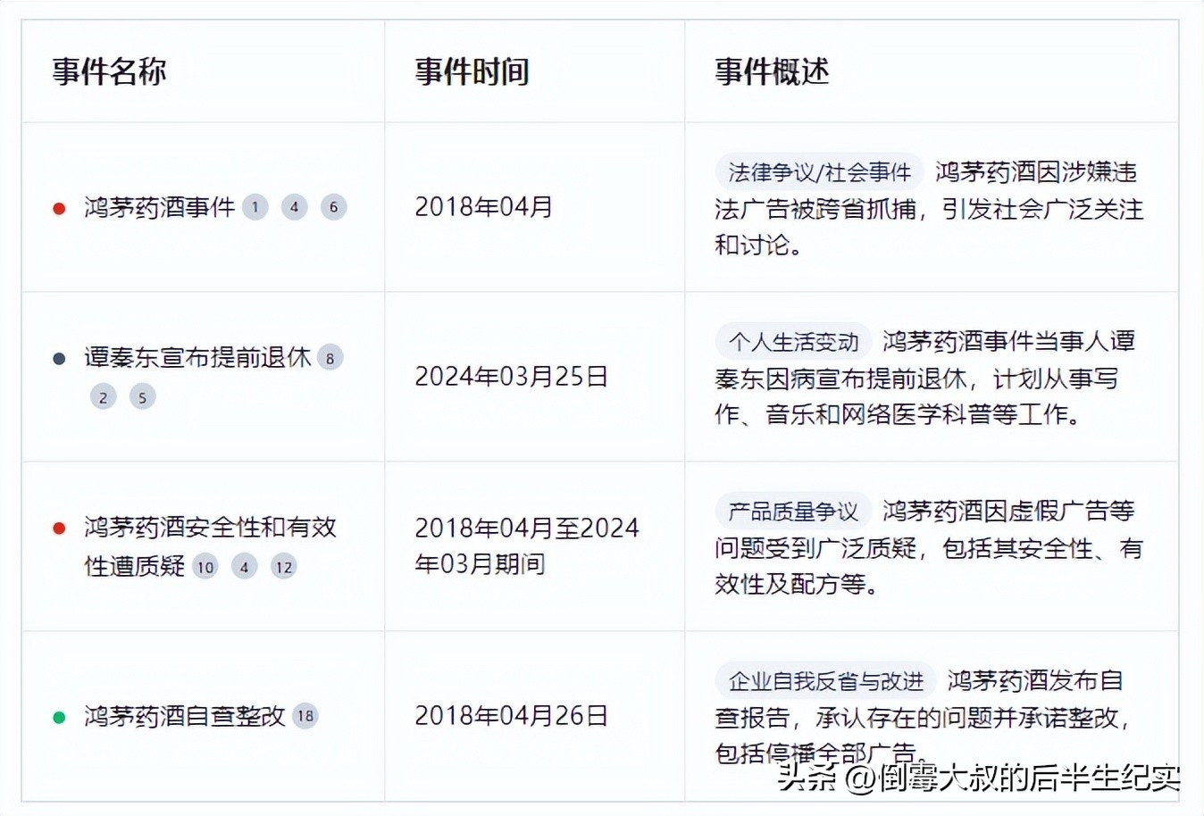 “鸿茅药酒”事件是一起因药品广告引发的争议事件,涉及的主要人物包括谭秦东医生和鸿茅国药公司。事件的起因是谭秦东医生发表文章,批评鸿茅药酒的广告违法,并指出其对多种疾病的治疗效果缺乏科学依据。这一行为引起了鸿茅国药公司的不满,随后公司报案称谭秦东损害了商品声誉,并造成了约142万元的经济损失。
