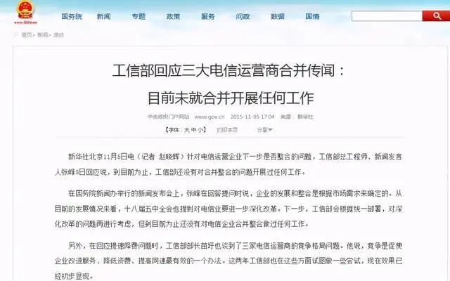 经向中国移动、中国联通、中国电信等公司核实,三家运营商均表示未接到公司要合并的通知,网上传言纯属谣言。而早在2015年11月,工信部曾回应三大电信运营商合并传闻称:目前未就合并开展任何工作。