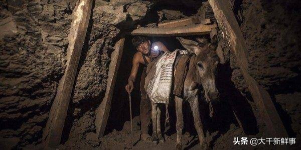 矿井里的道路低矮狭窄,非常黑暗,煤矿工人只能和驮着煤的驴子在矿道中慢慢摸索着前行。