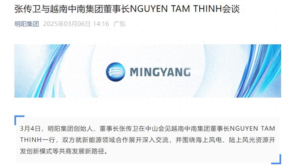 每经AI快讯,3月4日,明阳集团创始人、董事长张传卫在中山会见越南中南集团董事长NGUYEN TAM THINH一行,双方就新能源领域合作展开深入交流,并围绕海上风电、陆上风光资源开发创新模式等共商发展新路径。