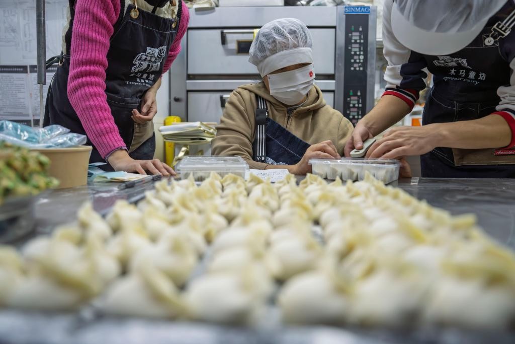 12月29日,餐厅工作人员和志愿者在一起包饺子。