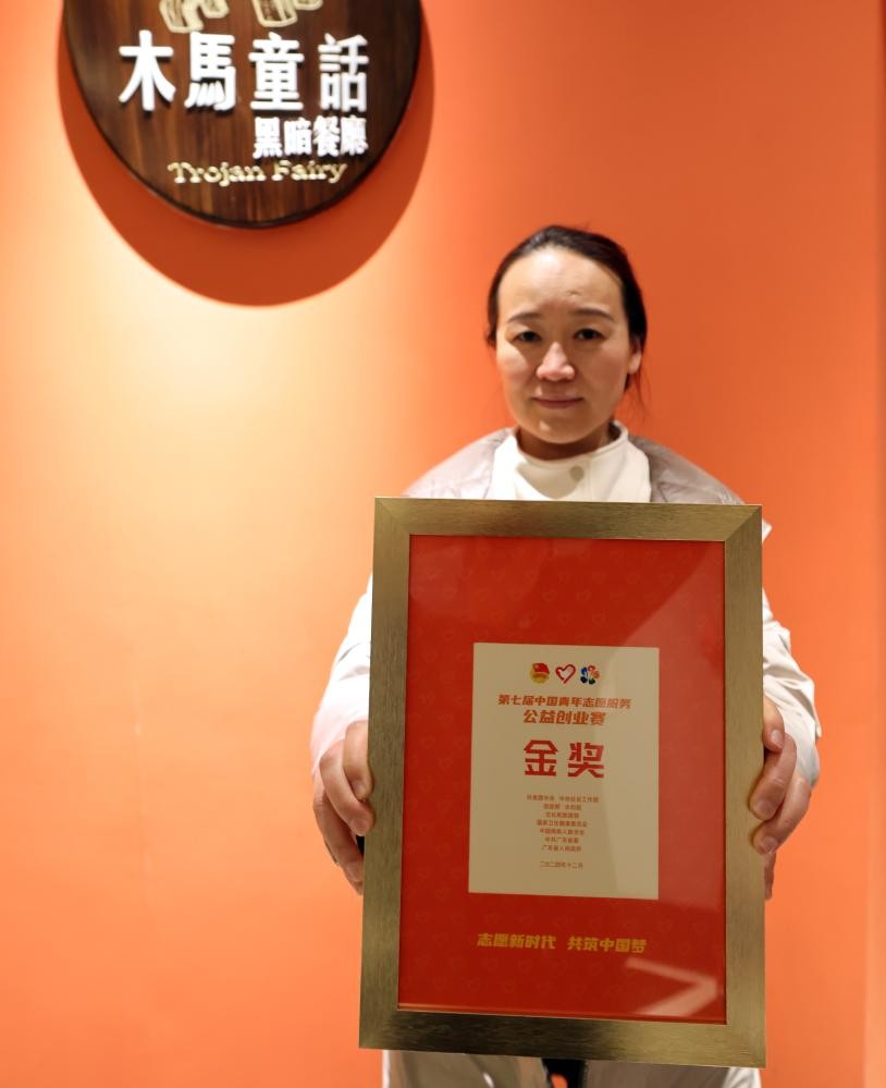 12月29日,餐厅创办者于爽在展示他们在第七届中国青年志愿服务公益创业赛上的获奖证书。于爽曾突发视网膜脱落,虽经手术恢复视力,但那段全盲的生活经历让她深受触动。她创建黑暗体验餐厅的初衷,是让视障人士能在里面平等的工作,帮助他们更好融入社会。