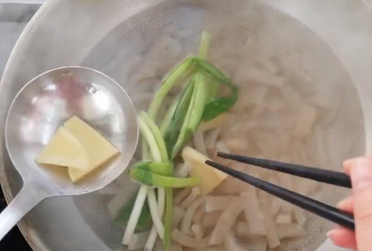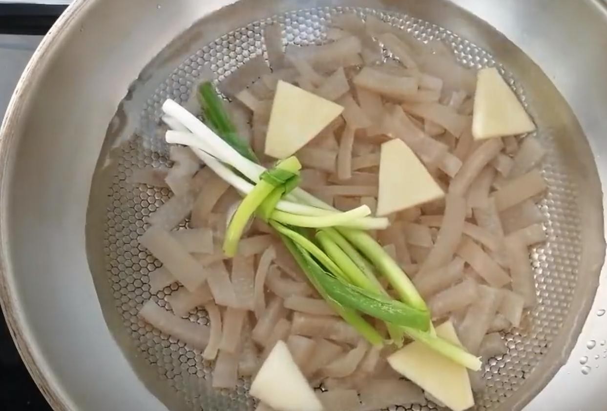 4,起锅冷水下入猪皮,加入3倍的水,加入姜片葱段,一小勺食盐,大火烧开转小火煮15分钟