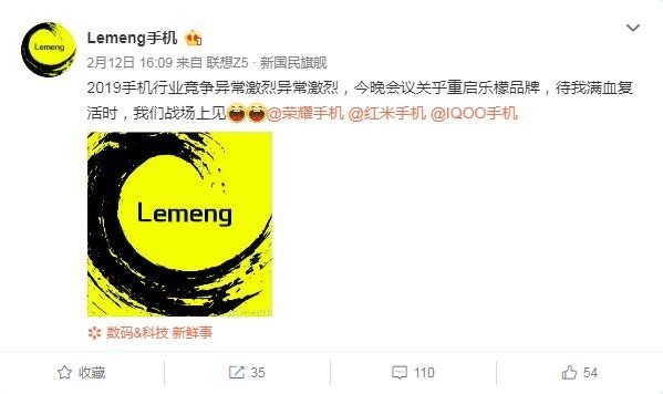 事情缘由是一个名为“Lemeng手机”的微博账号,该账户虽然没有微博认证,但是其发布的第一条微博内容就让人十分震惊:“2019手机行业竞争异常激烈,今晚会议关乎重启乐檬品牌,待我满血复活时,我们战场上见。同时还@了荣耀、红米和IQOO手机。”