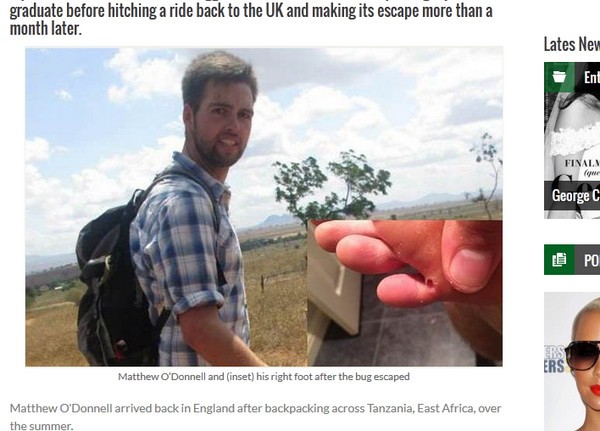 马修今年在英国普利茅斯大学完成学业后,利用暑假到坦桑尼亚当志工,事前就有被告知要注意当地盛行的沙蚤,但他跟同行的朋友还是中招了。