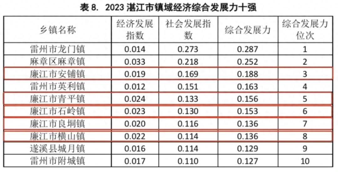 2023年湛江市镇域经济综合发展力十强榜单中,廉江市有五个镇入选,成为该年度湛江入选榜单最多的县(市、区)。同时,雷州、廉江、麻章、遂溪四个县(市、区)各有两个镇入选该榜单。这些镇在经济发展、产业升级、基础设施建设等方面表现突出,成为推动湛江市乃至广东省经济发展的重要力量。