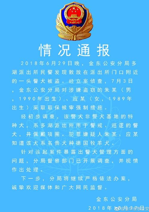 针对此前网传浙江金华一对夫妻将警犬当做流浪狗带走救助后,二人因涉嫌盗窃警犬被刑事立案一事,10月27日晚间,浙江省金华市公安局金东分局官方微博发布通报称,2018年6月29日晚,金东公安分局多湖派出所民警发现散放在派出所门口附近的一头警犬被盗。经立案侦查,7月3日,金东公安分局对涉嫌盗窃的朱某(男,1990年出生)、应某(女,1989年出生)采取取保候审强制措施。