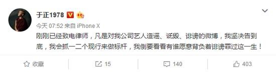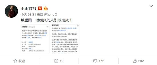 于正发博怒斥造谣:坚决告到底,从前是因为自己太仁慈
