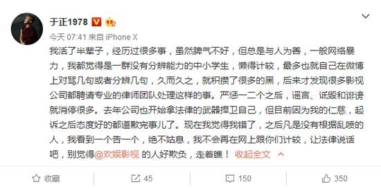 日前于正连发四条微博怒斥网友造谣诽谤。于正称一般造谣扩散的人都会遭到报应,过不好这一生,“永无翻身之日”。他表示,自己以前虽然脾气不好但总是与人为善,且一般网络暴力都是一群“没有分辨能力的中小学生”,懒得去跟他们计较,但现在开始将采取法律手段,见一个告一个,绝不姑息:“我倒要看看有谁愿意背负着诽谤罪过这一生!”