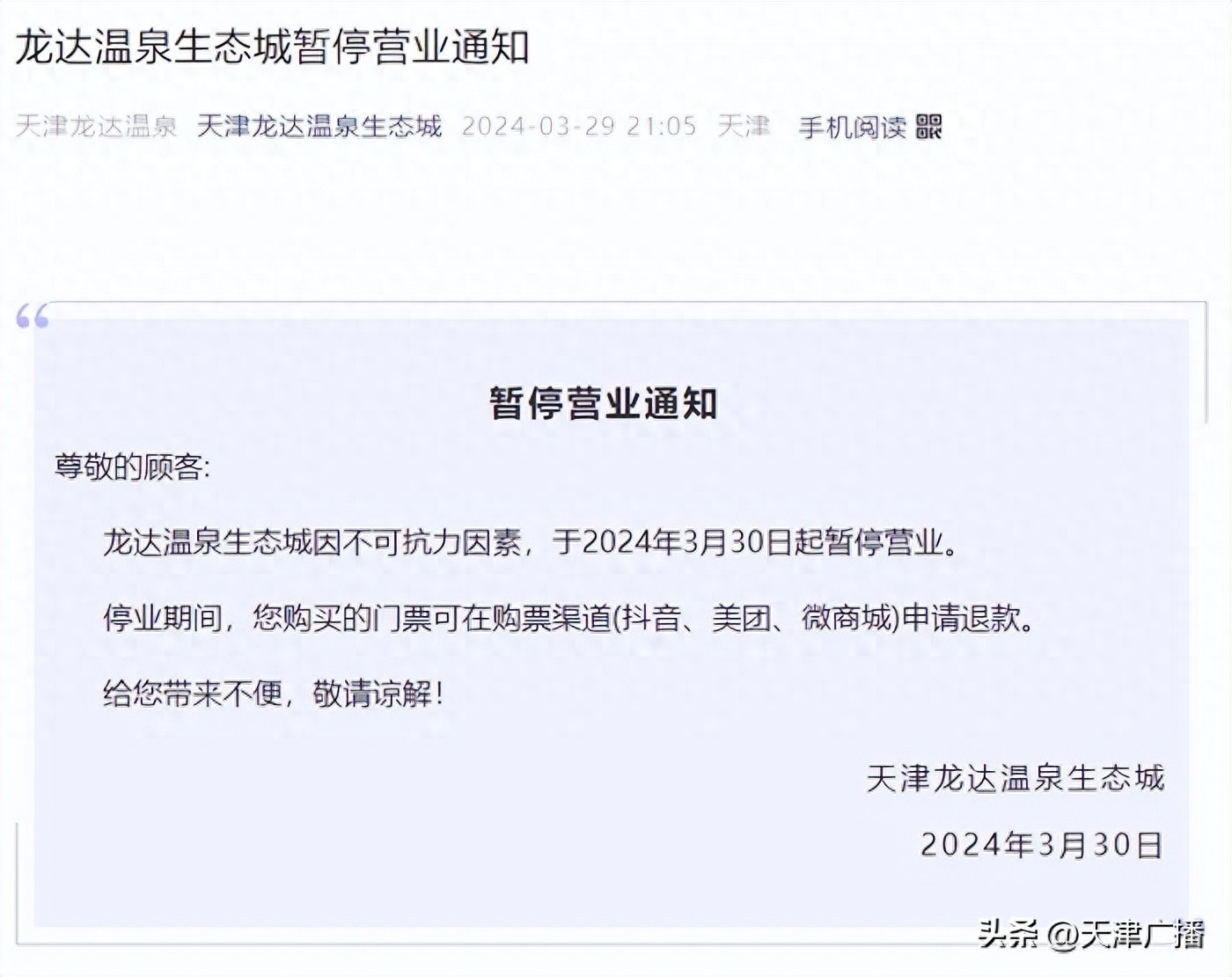 提醒 | 天津一温泉城突然停业!退款方式→