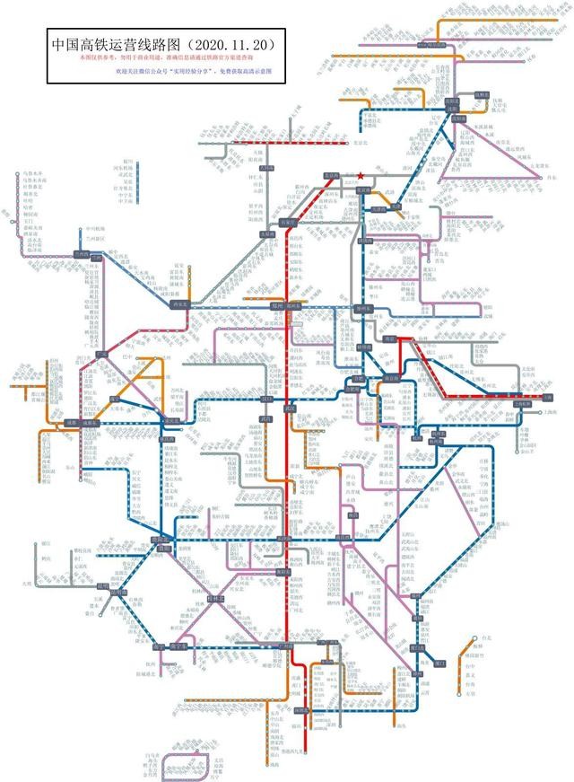 《中国高铁运营线路图》同步更新至20201120版,同时对部分站名进行了修正,部分版面进行了优化,需要原图的亲可留言联系。