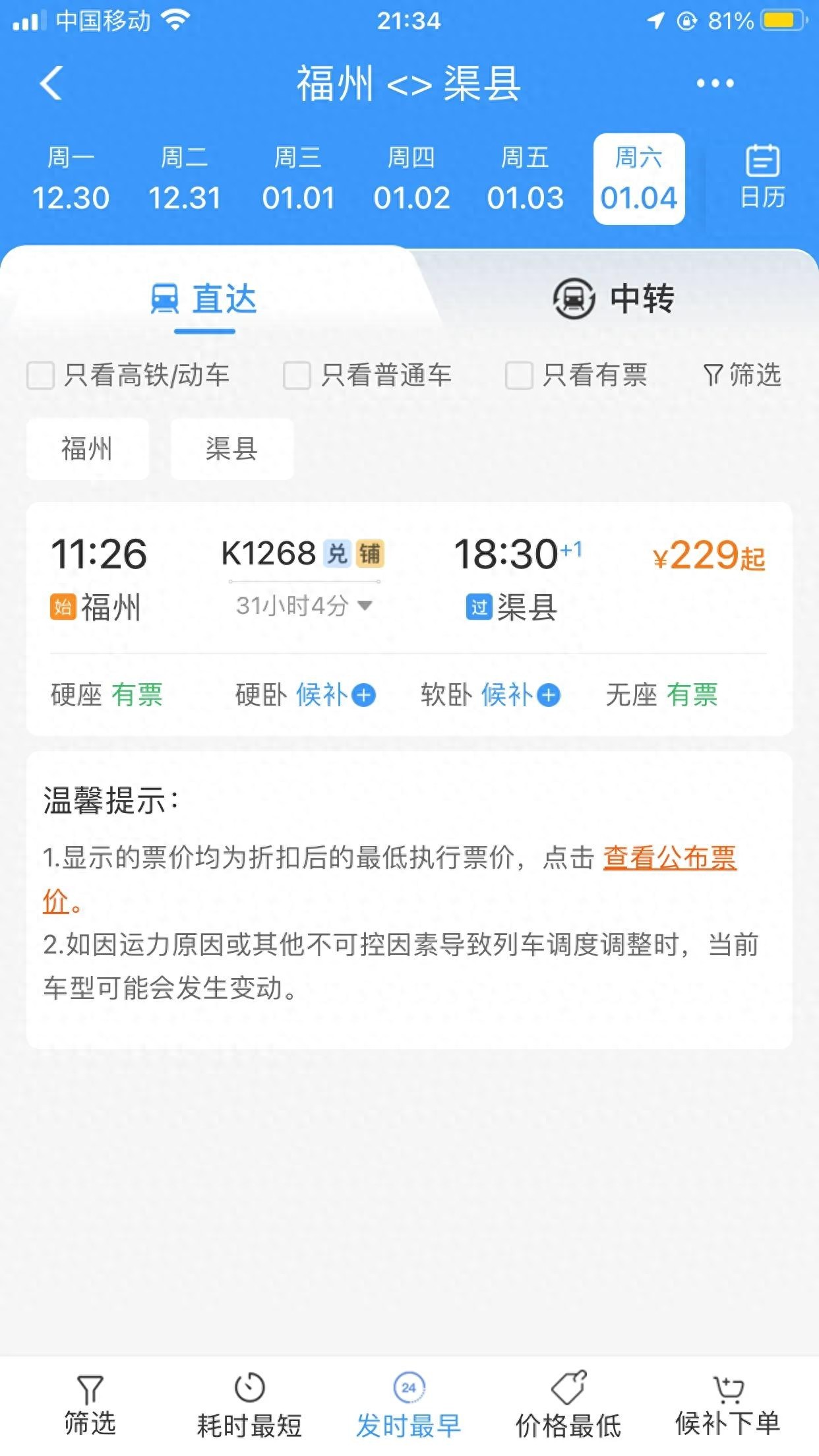 福州至重庆的K1268,有那么紧张吗?第一天就没有卧铺票了。国家在老百姓面前也是利益至上啊