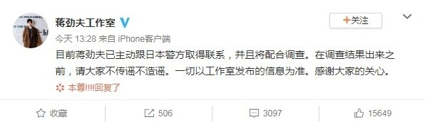 蒋劲夫工作室回应:已主动联系日本警方配合调查