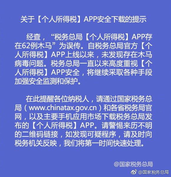 新京报快讯 据国家税务总局官方微博消息,经查,“税务总局‘个人所得税’APP存在62例木马”为误传。自税务总局官方“个人所得税”APP上线以来,未发现存在木马病毒问题。税务总局一直以来高度重视“个人所得税”APP安全,将继续采取各种手段加强安全监测和保护。