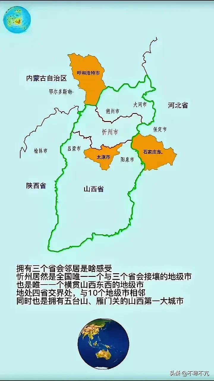 还有忻州狠的是它和三个省的省会接壤了,内蒙古的省会呼和浩特,河北的省会石家庄,自己所在省的山西省的省会太原。
