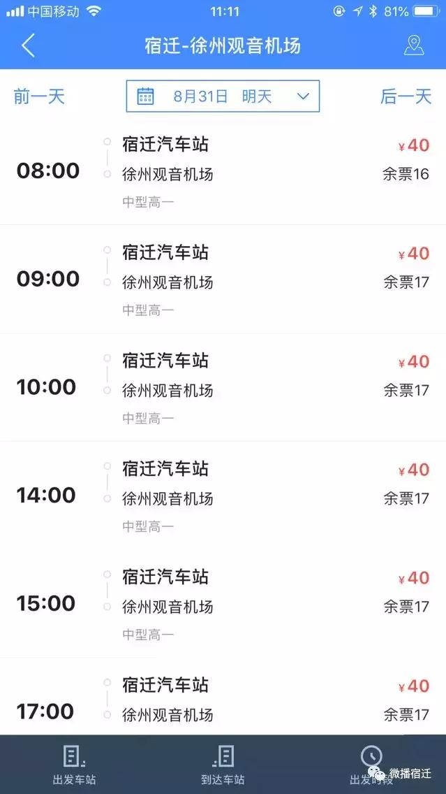 乘坐机场班车的旅客,可以直接到宿迁汽车客运站购票乘车,也可通过巴士管家手机订票及查询宿迁至徐州观音机场班车的班次及票价信息。