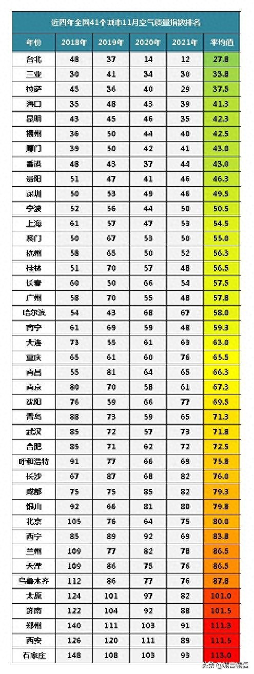 全国41个主要城市近四年11月空气质量排名