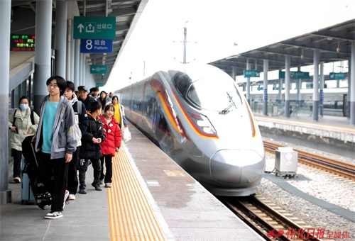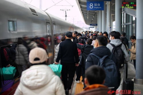 1月14日,春运首日,怀化高铁南站内人头攒动,旅客们拖着大小行李,脚步匆匆。工作人员忙碌不停,耐心解答旅客问题,引导大家顺利进站乘车。(怀化日报全媒体记者 田敏 彭军 摄)