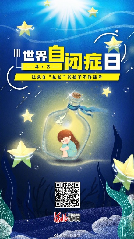 【世界自闭症日 |让来自星星的孩子 不再孤单!】今天是第14个世界自闭症日。自闭症,又称孤独症,是一种先天性的广泛性发育障碍疾病,造成儿童交流、语言、情感、认知、行为等方面的障碍。人们习惯将自闭症患者称作“星星的孩子”,他们生活在自己的世界,独自闪烁。我国每68名孩子中约有1名患自闭症