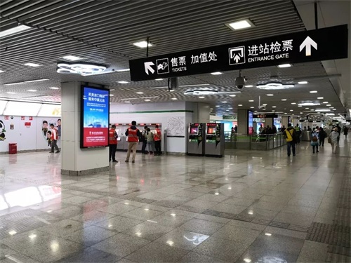 从9号口进站后,通过长廊,经过安检,就可以购票进站了。沿途有地铁工作人员,志愿者为大家指引。