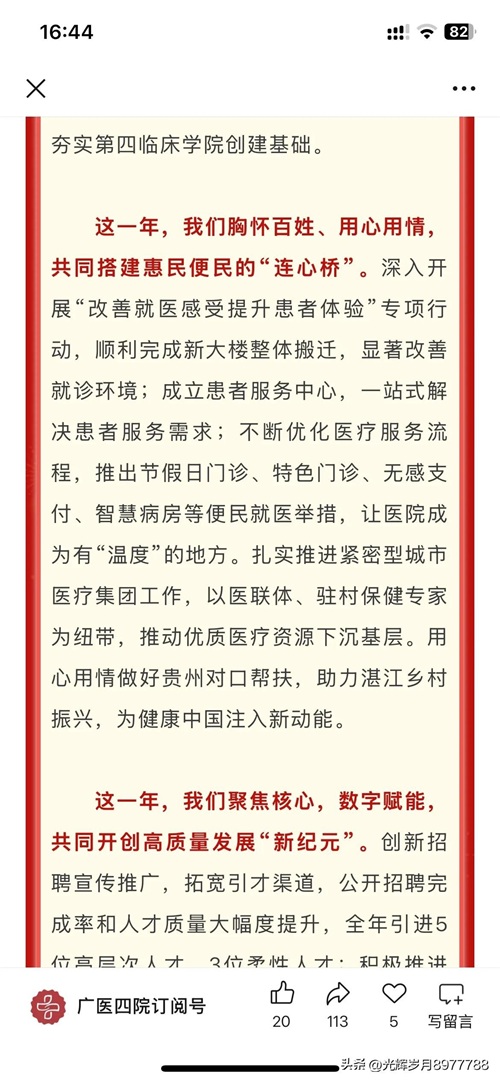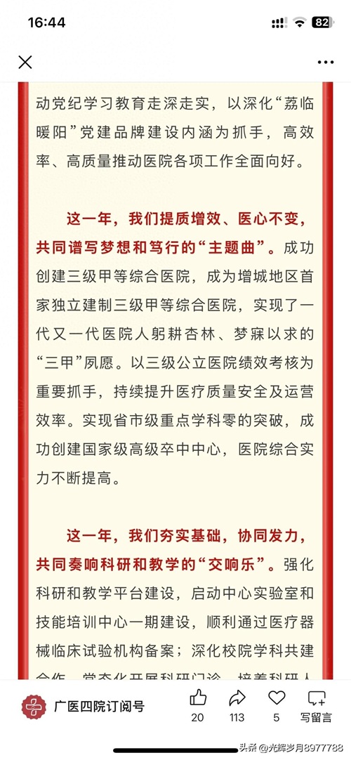根据广州医科大学附属第四医院在新年贺词中官方公布的成果显示,广州医科大学附属第四医院在今年以来正式成功创建三级甲等综合医院。标志着广州医科大学系列附属医院再一次取得的突破,三级甲等综合医院是大型重点医院迈向更高领域的重要基础,标志着该医院已经成为了区域的医疗中心,具备的一定的医疗救治能力。同时新增了一个广东省重点临床专科以及广州市重点学科整体专科实力达到全市全省领先水平,在学科平台中成功申请国家卒中中心等应急救救治中心,充分加强了医院的整体实力。