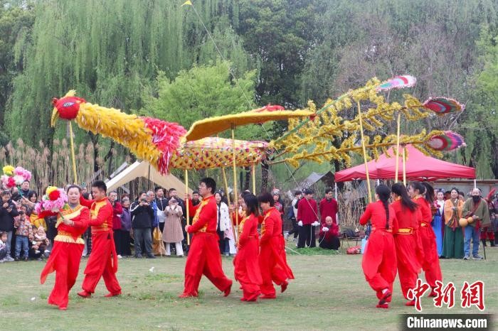 3月29日,浙江省桐乡市河山镇八泉村,“舞凤”表演吸引民众围观。黄彦君 摄