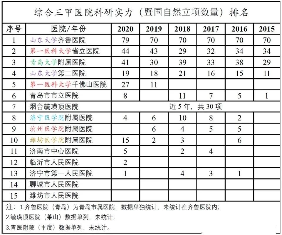 根据山东省最新的综合三甲医院科研实力排名,该份榜单列举了近六年山东省内前15名综合三甲医院的立项数量,这15所医院也是代表着山东省的医疗实力。