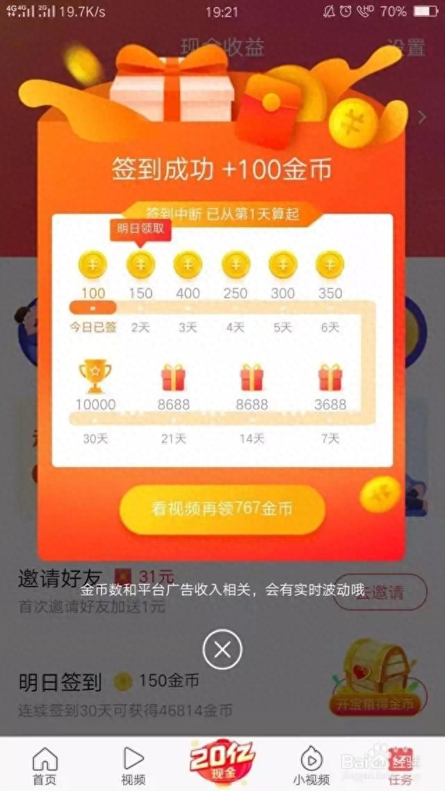 1、每日签到,第一天是100金币,连续签到会增加金币