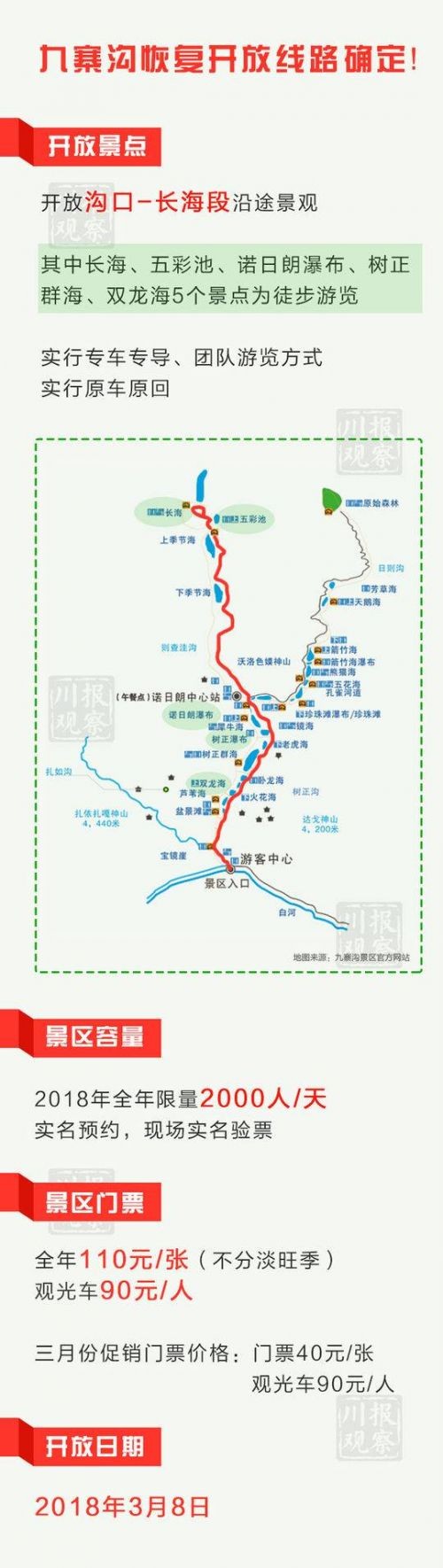 新华社成都3月1日电(记者张超群)1日,记者从四川省阿坝藏族羌族自治州旅游产业发展领导小组办公室获悉,九寨沟景区将于3月8日起在“限区域、限流量、限时段、限方式”的前提下逐步开放,并下调门票价格,使景区回归其公益属性。[九寨沟3月8日起恢复开放:促销门票价格40元 每天限2000人]
