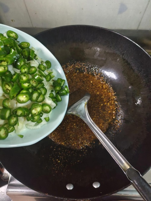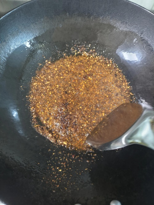 锅中倒油,油不能太热然后放两勺辣椒面,紧接着把小蒜倒进去!