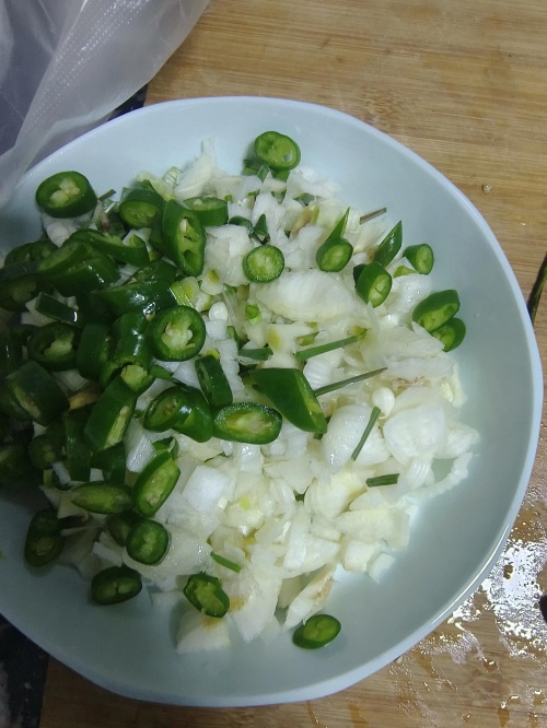 小蒜洗干净然后切碎,再配上点线椒切碎